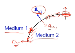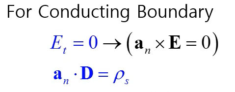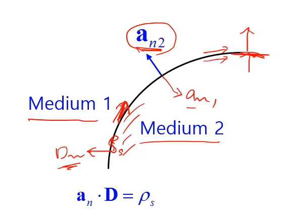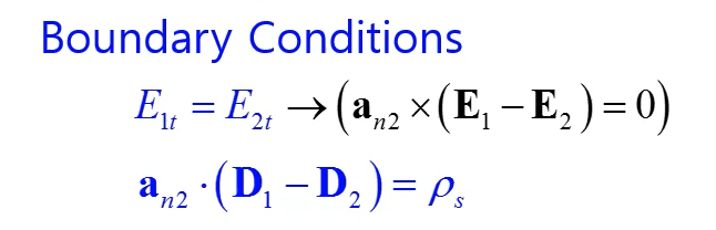 Electric field의 접선 방향의 성분은 서로 같다. 법선 방향 성분은 D1과 D2가 같아지는데